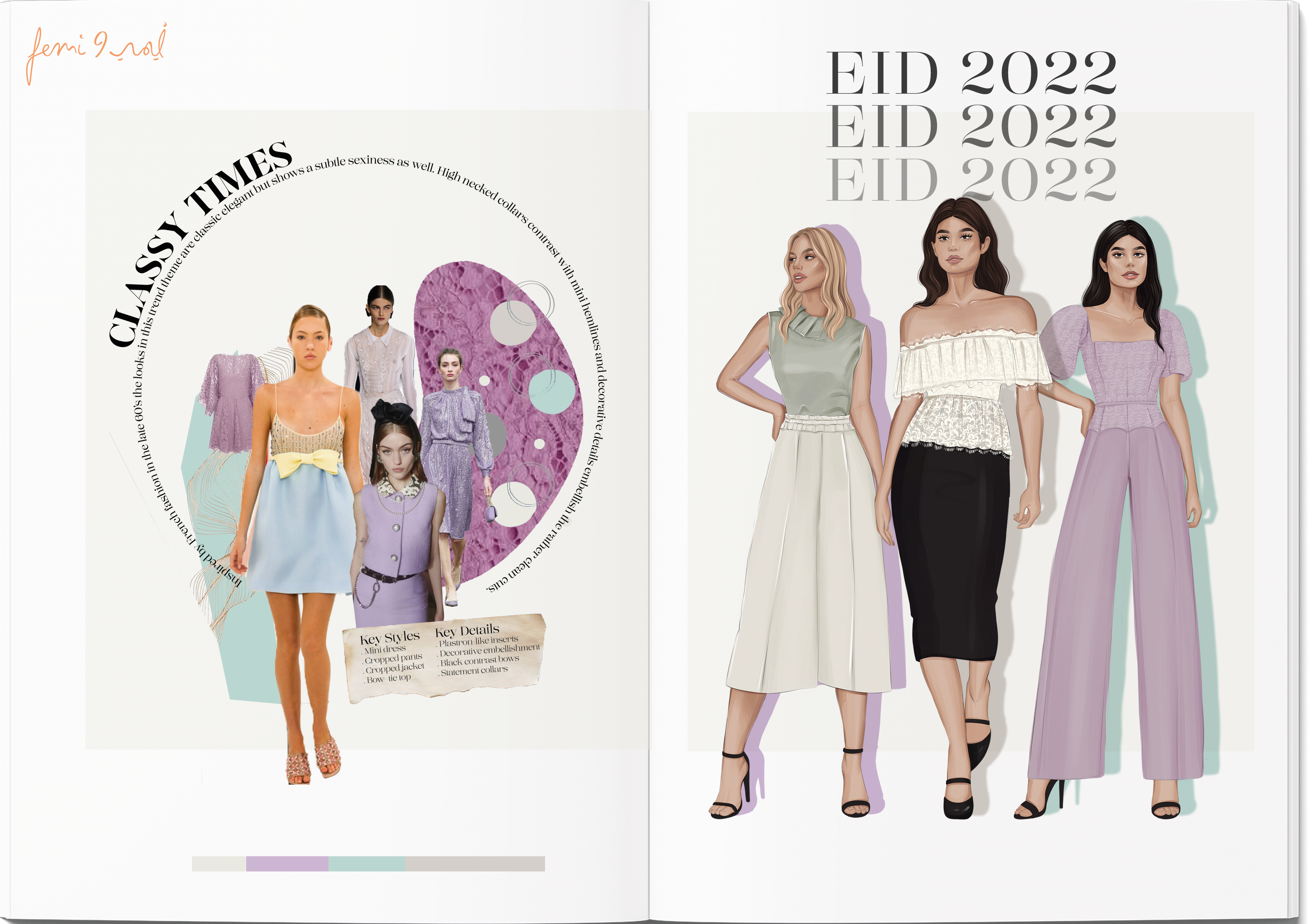 Inspired by French fashion in the late 60’s the looks in this trend theme are classic elegant but show a subtle sexiness as well. High necked collars contrast with mint hermanes and decorative details embellish the rather clean cuts.