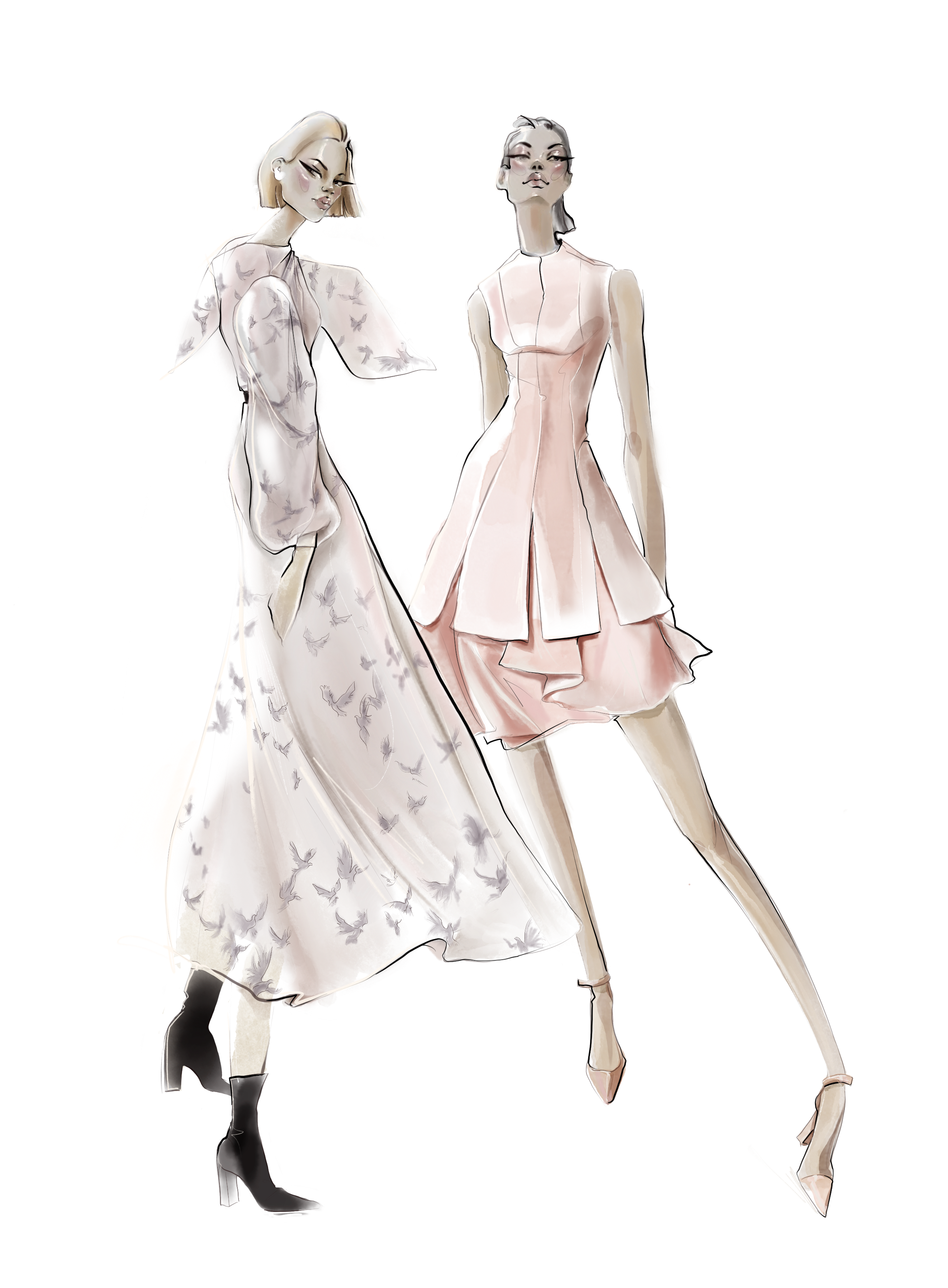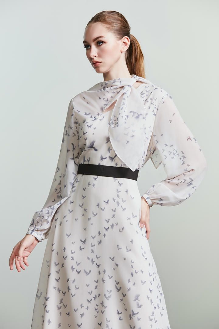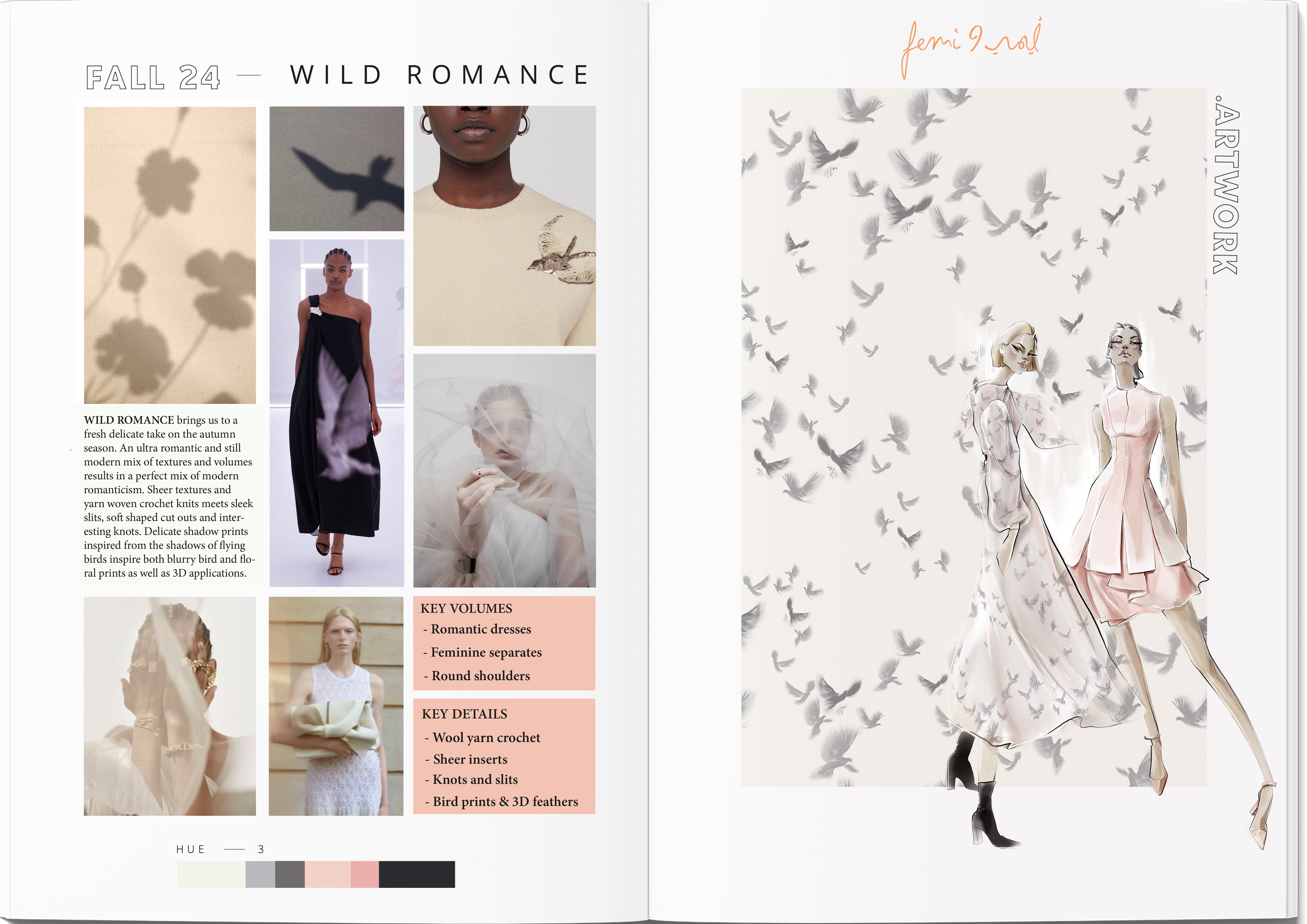 Wild Romance brings us to a fresh delicate take on the autumn season. An ultra romantic and still modern mix of textures and volumes results in a perfect mix of modern romanticism. Sheer textures meets sleek slits, soft shaped cut outs and inter- esting knots. Delicate shadow prints inspired from the shadows of flying birds inspire both blurry bird and flo- ral prints.